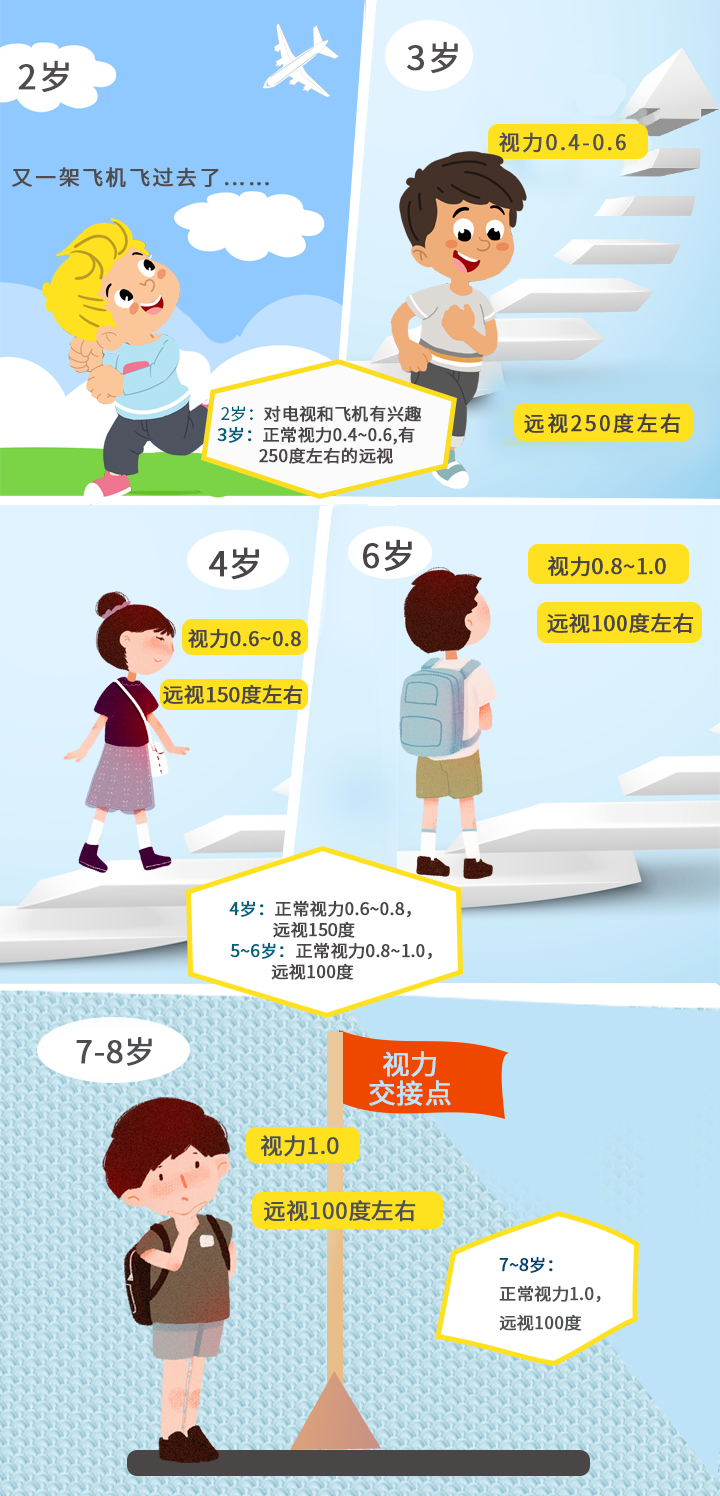 3歲到6歲的幼兒園階段,除確保足夠量的戶外時間,不要過早讓孩子學寫字和過量近距離閱讀,不得以使用電子產(chǎn)品時,應遵從使用15分鐘休息眼睛10分鐘法則,并早期建立屈光發(fā)育檔案,每半年檢查視力,明確孩子遠視儲備情況。